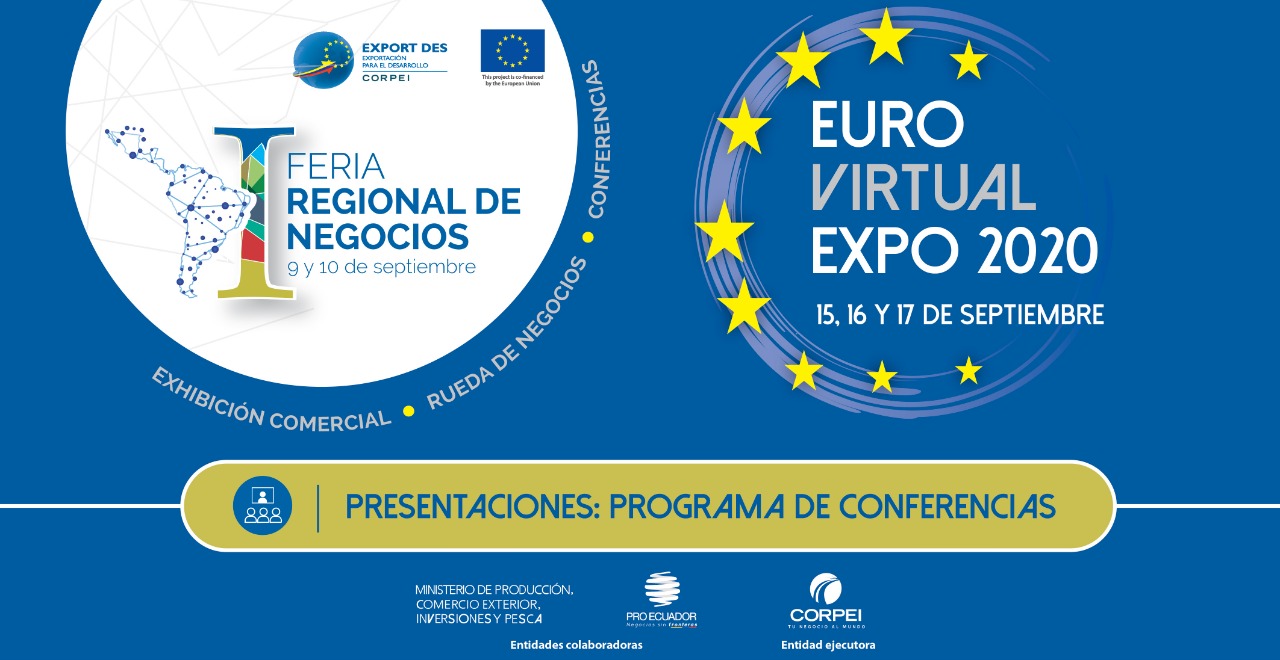 Durante dos semanas de septiembre, se llevaron a cabo la I Feria Regional de Negocios y la Euro Virtual Expo 2020, eventos organizados por CORPEI en colaboración del Ministerio de Producción, Comercio Exterior, Inversiones y Pesca. Con la participación de aproximadamente 100 empresas ecuatorianas de varios sectores productivos, 80 compradores de la Región y de la Unión Europea, y más de 800 inscritos en ambos eventos.